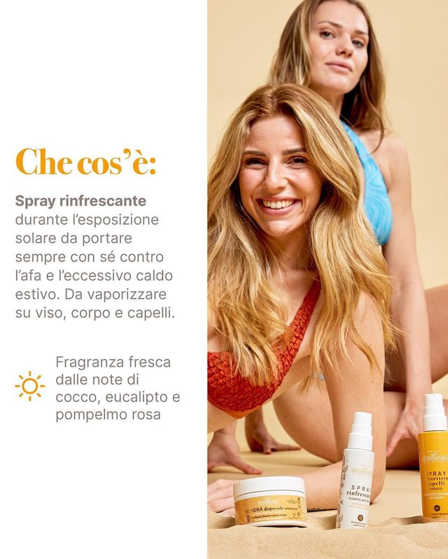 Spray rinfrescante durante l’esposizione solare da portare sempre con sé contro l’afa e l’eccessivo caldo estivo. Da vaporizzare su viso, corpo e capelli.