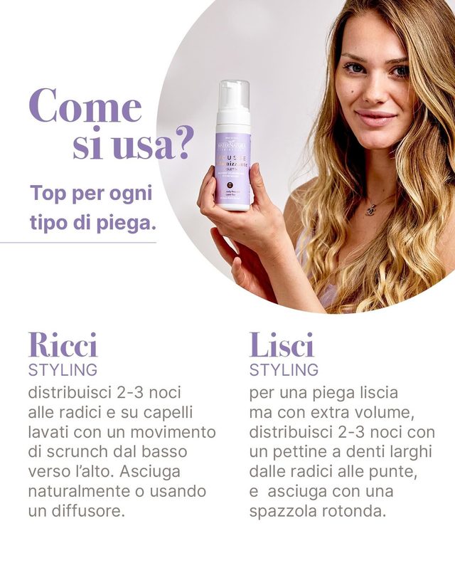 Per una piega riccia distribuisci 2-3 noci di schiuma su capelli lavati e tamponati con un movimento di scrunch dal basso verso l’alto. Asciuga naturalmente o potenzia l’effetto con il calore, usando un diffusore e asciugando a testa in giù.